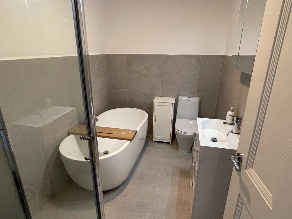 Recessed lighting, tiled floor, partly wall tiled, double wall radiator, white high gloss high and low level kitchen units, unit lighting, stainless steel sink, integrated Hotpoint electric oven, integrated Hotpoint glass hob, stainless steel / glass extractor fan, integrated dishwasher, CDA integrates microwave, Beko integrated fridge freezer, 4 double power points with USB ports, 1 double power point, plumbed for washing machine.
