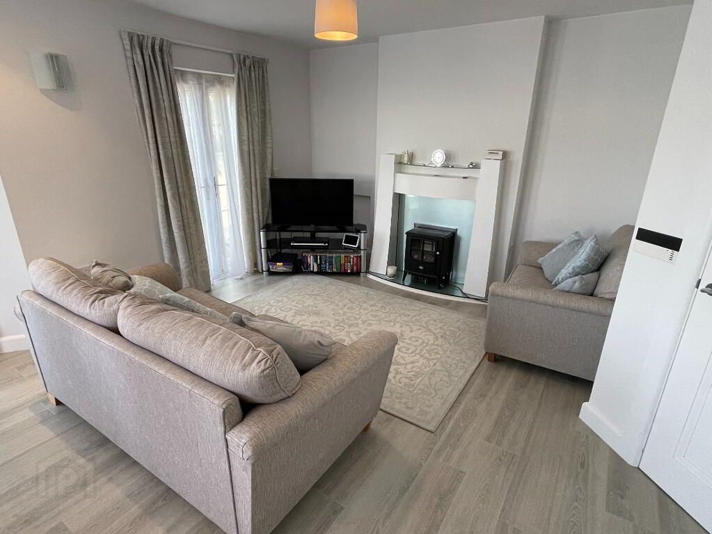 2 centre lights, recessed lighting, 3 wall lights, laminate floor, 2 double wall radiators, white fireplace with feature lights suitable for electric fire, TV point, telephone point, 5 double power points, 4 x 5amp power points, glazed French doors to outside, intercom system, glazed French doors to kitchen.