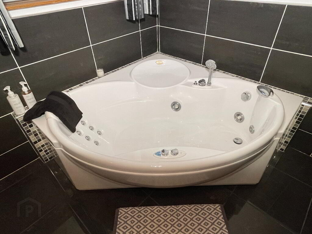 Centre light, extractor fan, thermostat, tiled floor (underfloor heating), partly wall tiled, white bathroom suite consisting of Laufen wash hand basin and toilet, Jacuzzi corner bath, walk-in shower, towel radiator, shaving point.