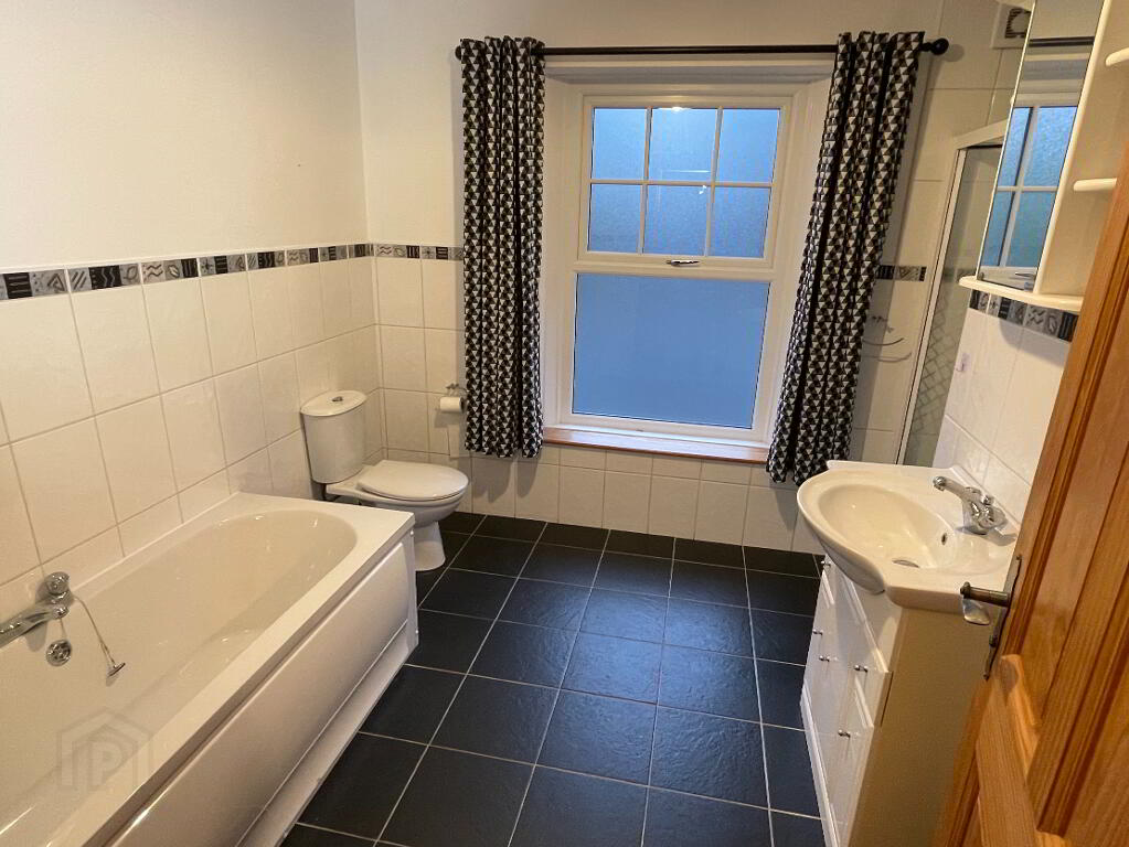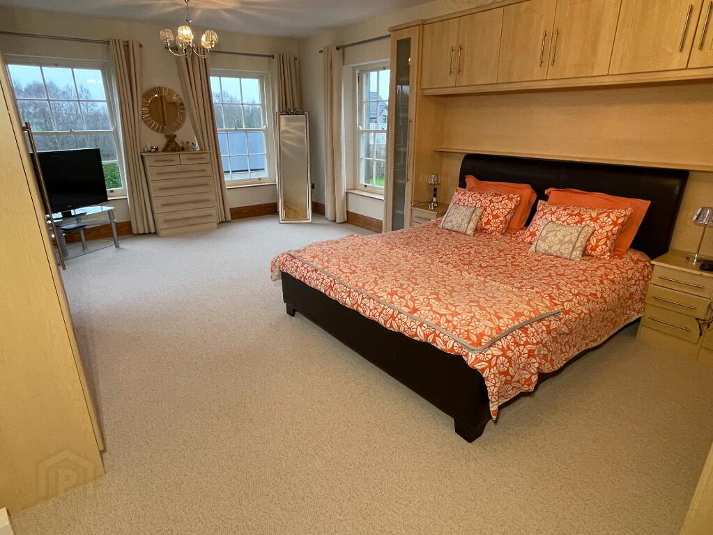 2 centre lights, thermostat, tiled floor (underfloor heating), TV point, telephone point, 6 double power points, mahogany fireplace with marble insert and hearth (suitable for solid fuel).