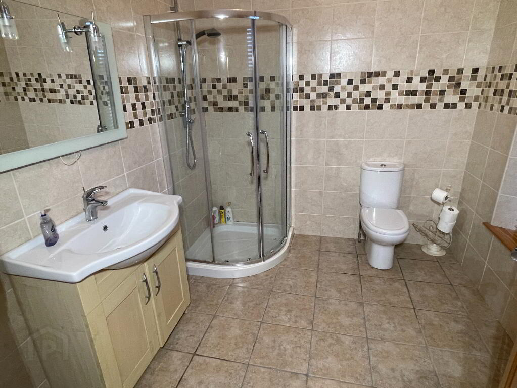 Centre light, extractor fan, tiled floor (underfloor heating), fully wall tiled, white toilet, wash hand basin in vanity unit, walk-in shower, towel radiator, wall mirror with lighting.