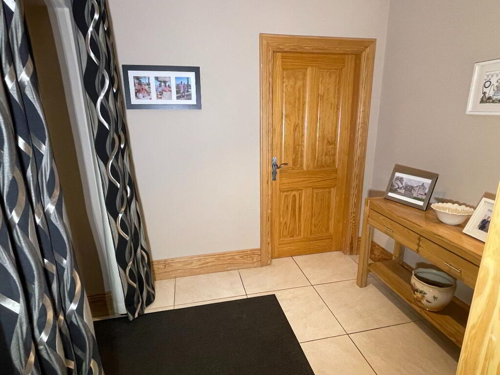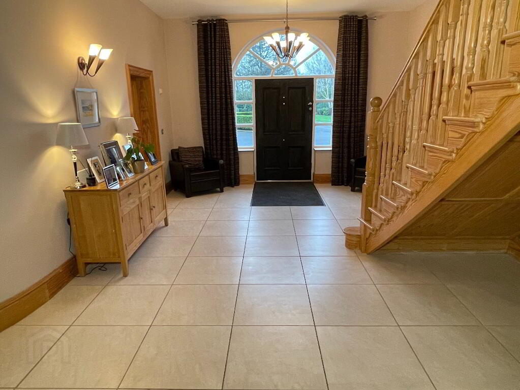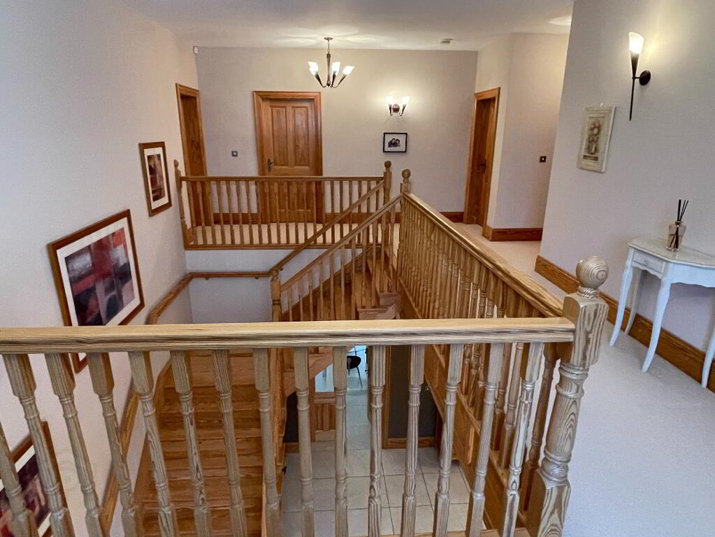 2 centre lights, 3 wall lights, curved feature wall, telephone point, 2 double power points, thermostat, tiled floor (underfloor heating), Georgian style wooden entrance door, pitch pine staircase.