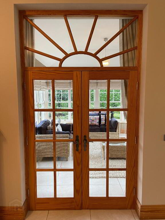 2 centre lights, thermostat, tiled floor (underfloor heating), curved feature wall, half glazed hard wood entrance door with 2 glass panels to side, wooden French doors to rear, access to roof space.