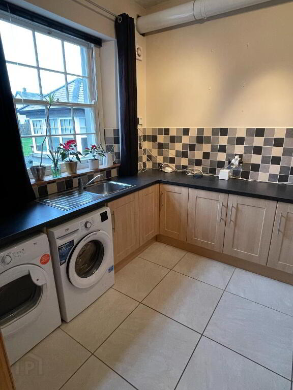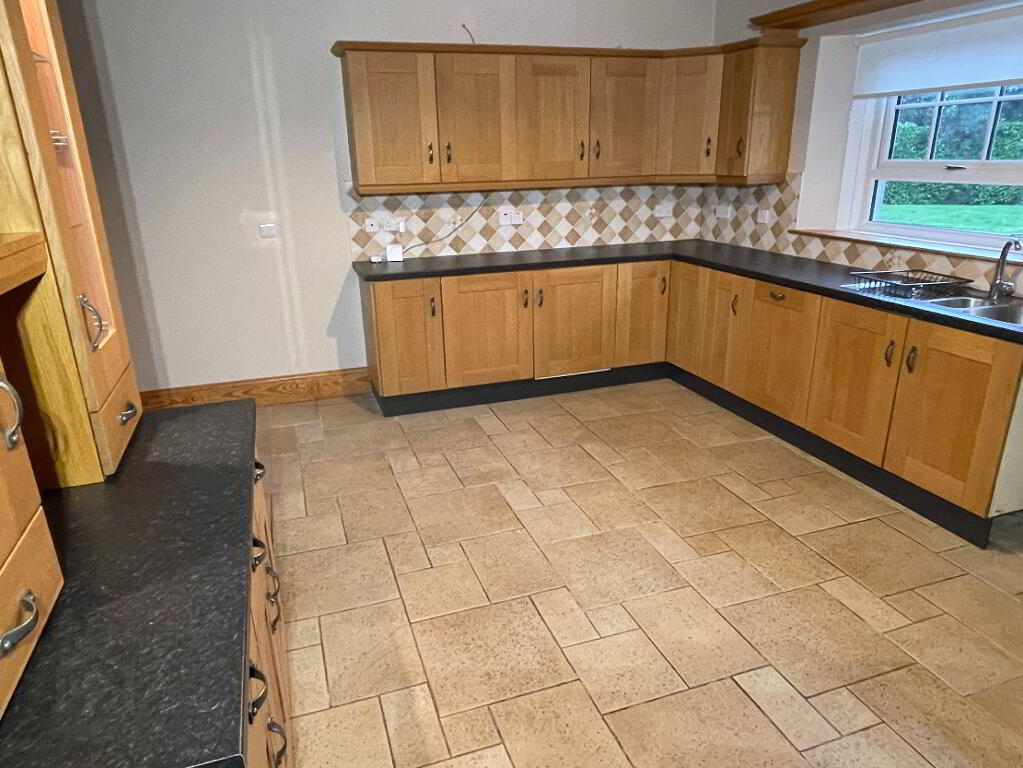 Centre light, extractor fan, thermostat, tiled floor (underfloor heating), partly wall tiled, 2 double power points, beech style high and low level storage units, plumbed for washing machine, space for tumble dryer, Grant condensing oil burner, central heating control.