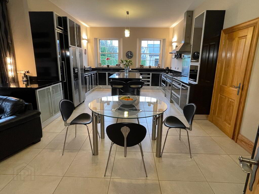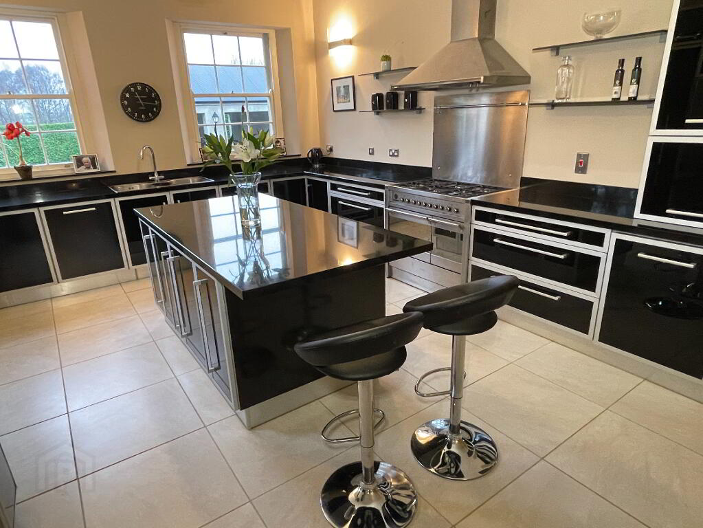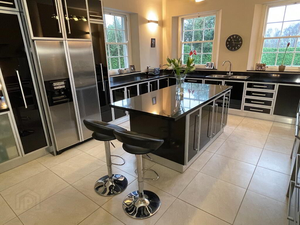 2 centre lights, 2 wall lights, thermostat, tiled floor (underfloor heating), 6 double power points, TV point, telephone point, black high gloss high and low level kitchen units and central island with seating area, 4 glass wall shelves, Smeg stainless steel dual fuel cooker with stainless steel splashback, Smeg stainless steel extractor fan, Franke stainless steel sink, Beko integrated dishwasher, space for American fridge freezer.
