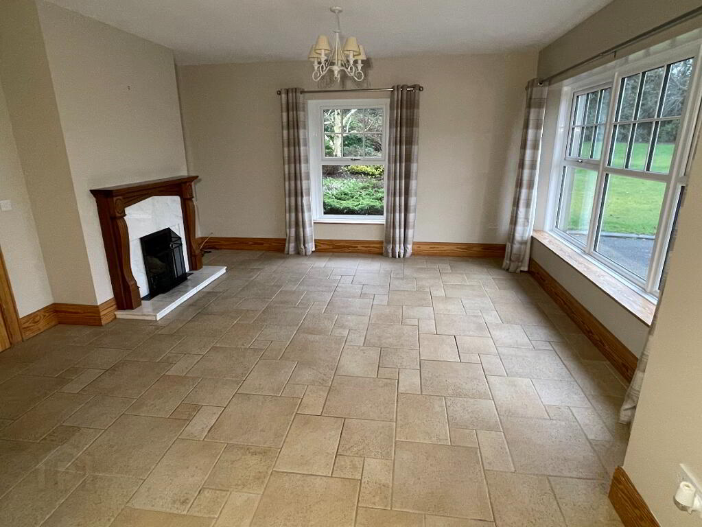 Centre light, tiled floor (underfloor heating), 5 double power points, TV point, telephone point, limestone fireplace with slate hearth and multifuel stove.