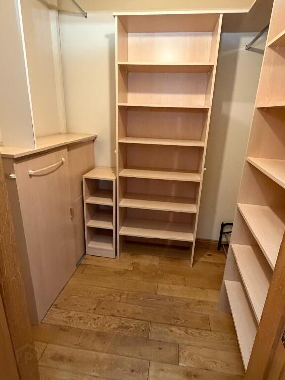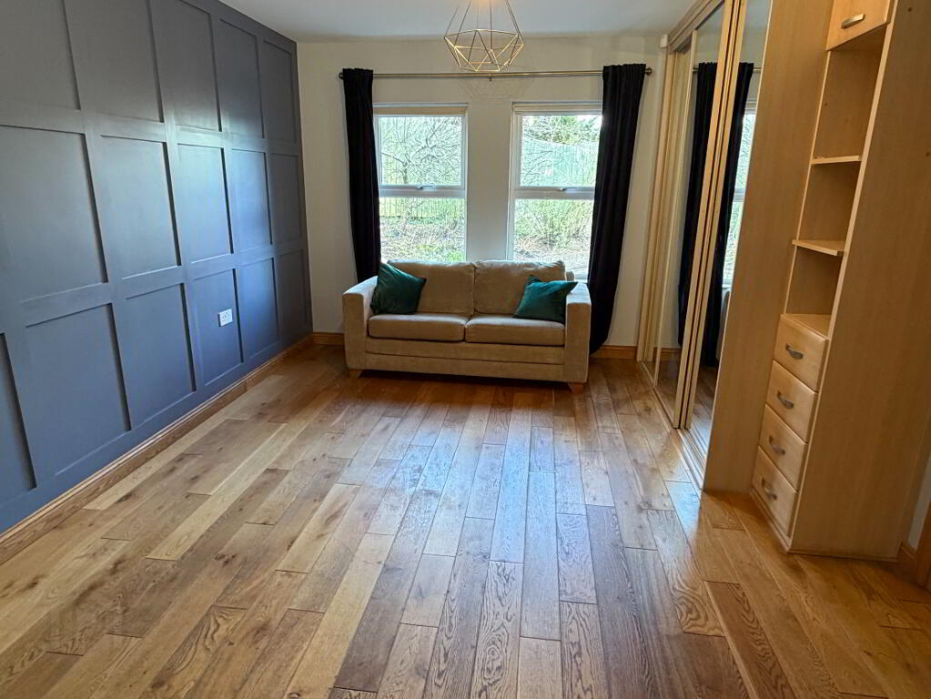 Centre light, oak solid wooden floor, built-in shelving and rails.
