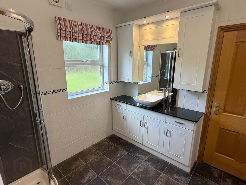 Recessed lighting, extractor fan, fully wall tiled, tiled floor, towel radiator, white bathroom suite consisting of toilet, bidet, jacuzzi style bath, built-in bathroom cabinet with wash hand basin and mirror, granite top, walk-in shower with UPVC panelling to wall.
