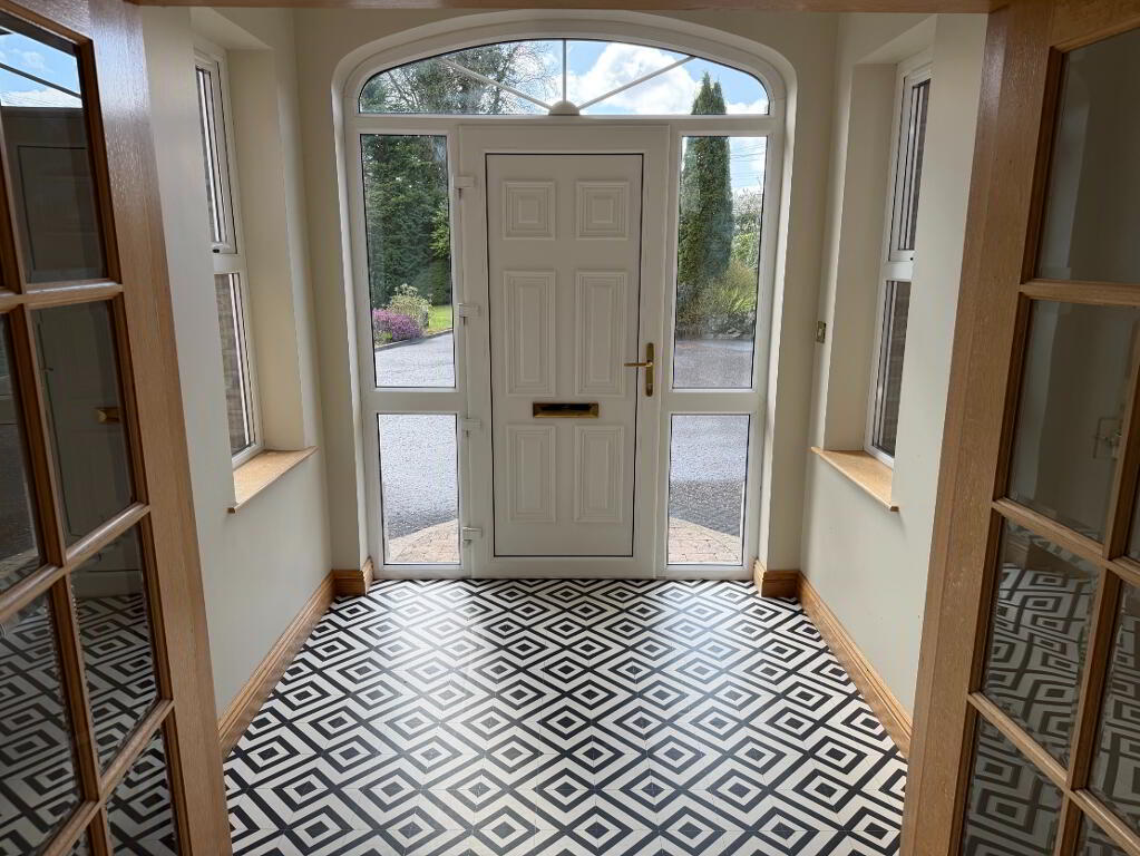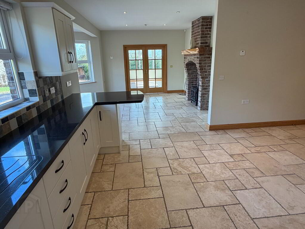 3 centre lights, tiled floor, underfloor heating, thermostat, 3 double power points, Videx intercom, oak glazed French door to sitting room.