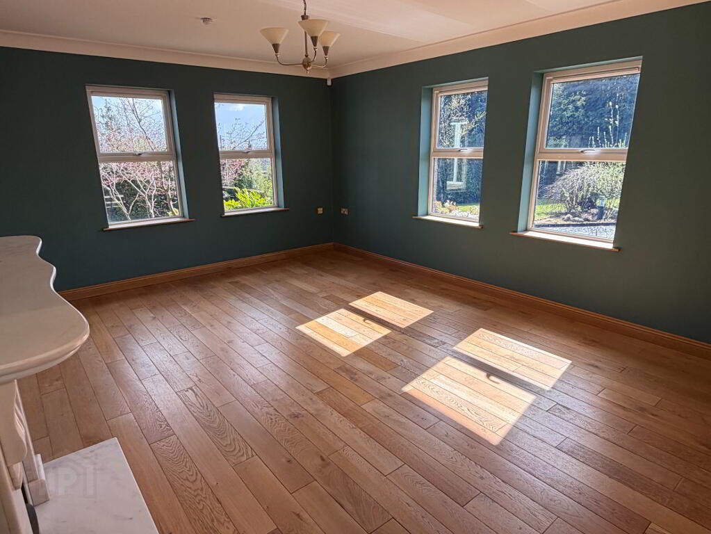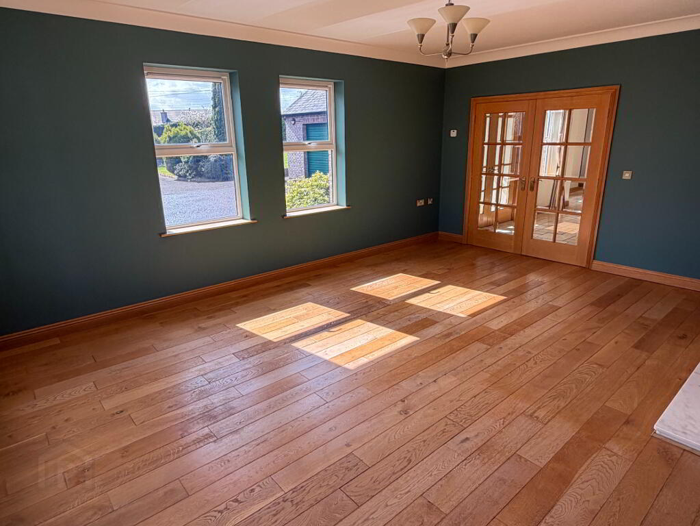 Centre light, coving, solid oak wooden floor, underfloor heating, thermostat, marble gas fireplace with gas fire, TV point, 4 double power points, 3 single power points, oak glazed French doors to sunroom.