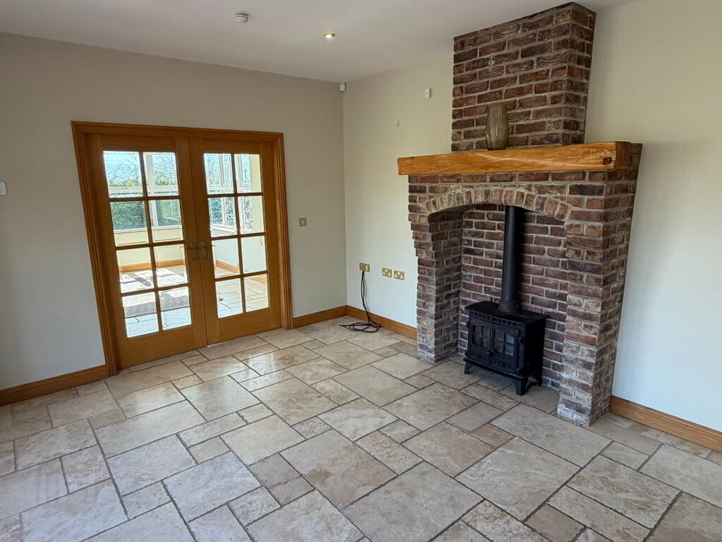 Recessed lighting, tiled floor, underfloor heating, thermostat, 5 double power points, brick built fireplace with multifuel stove and oak mantlepiece, oak glazed French doors to sunroom.