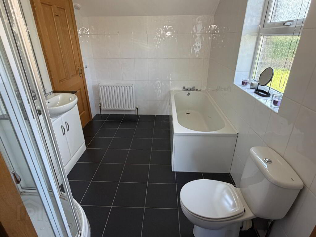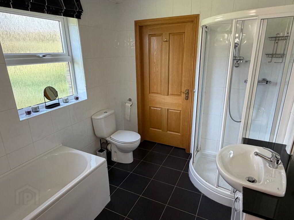 Recessed lighting, extractor fan, tiled floor, fully wall tiled, double radiator, wash hand basin in vanity unit, bath and walk-in shower.