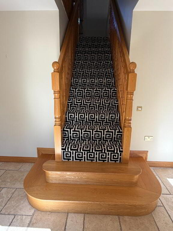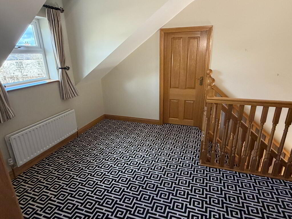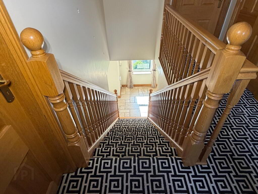 Centre light, recessed lighting, stairs and landing carpeted, oak staircase, double radiator, thermostat, 1 double power point, shelved airing cupboard.