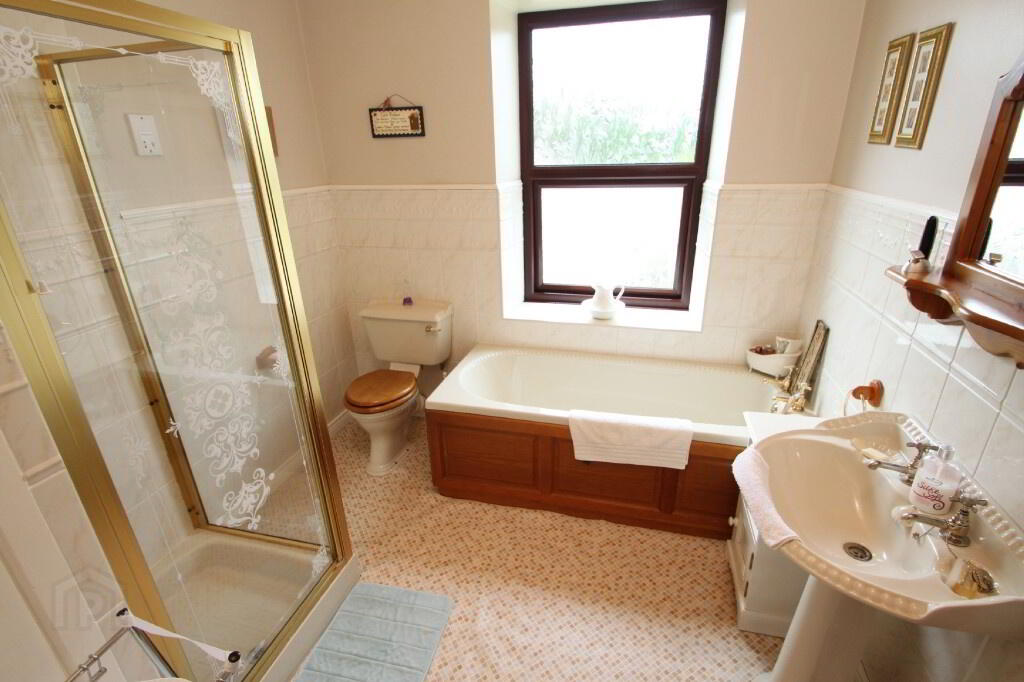 Centre light, pine tongue and groove ceiling, champagne bathroom suite consisting of toilet, pedestal wash hand basin and bath, walk-in Mira Sport electric shower, vinyl floor covering, single radiator, shelved airing cupboard, extractor fan, partly wall tiled, shaving point.