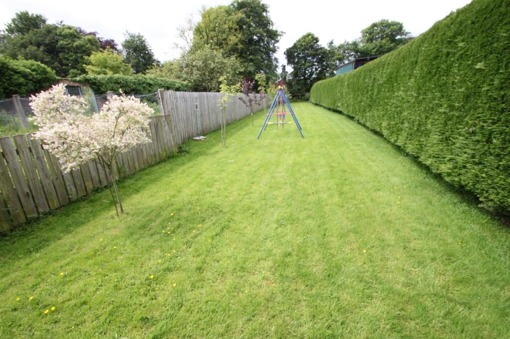 Lawns with flower and shrub beds, oil tank, surrounded by wall, fence and hedge, side gate.