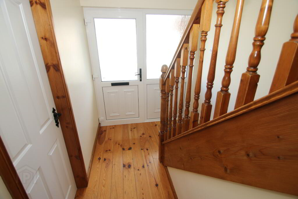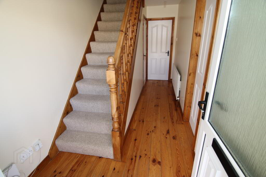 Centre light, solid pine wooden floor, single radiator, 1 double power point, telephone point, ½ glazed UPVC front door with glazed side panel, under stairs storage cupboard (centre light, single power point).