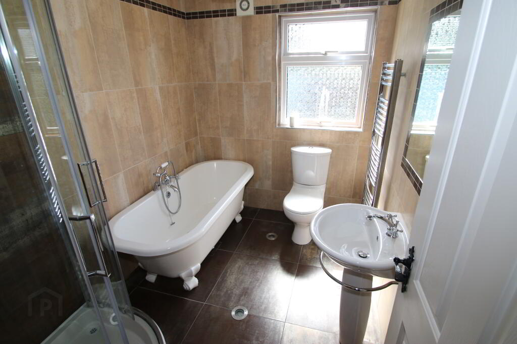 Centre light, fully wall tiled, floor tiled, floor lighting, extractor fan, white bathroom suite consisting of toilet, pedestal wash hand basin, free standing bath, walk-in Mira Sport electric shower, towel radiator, integrated mirror.