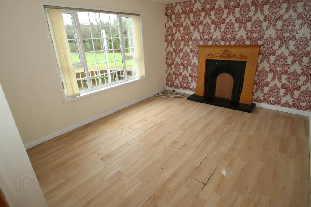 Centre light, laminate floor, single radiator, 3 single power points, telephone point, TV point, wood style fireplace with cast iron style insert and granite hearth, pine glazed French doors to hall.