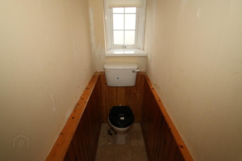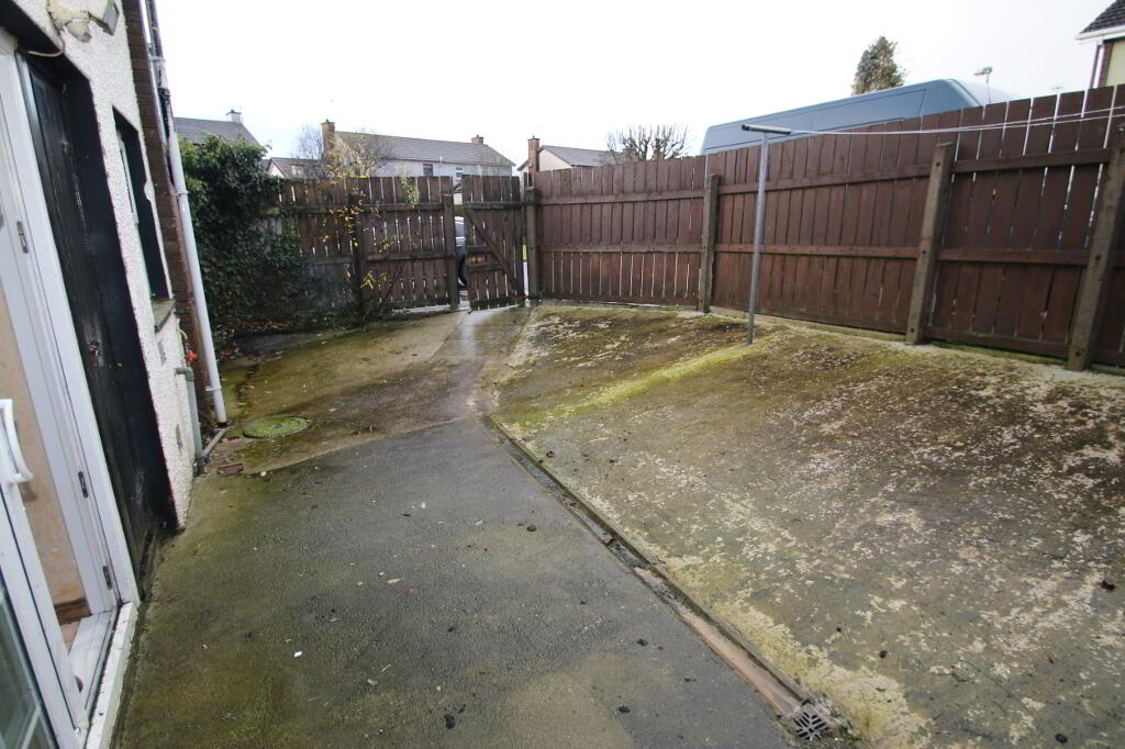2 centre lights, tiled floor, single radiator, patio door to rear yard, 2 single power points, 2 double power points, high and low level kitchen units, stainless steel sink, integrated gas hob, plumbed for washing machine, space for fridge freezer, understairs storage cupboard, central heating control.