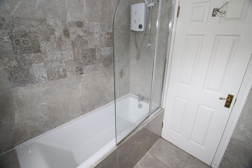Centre light, porcelain tiled floor, fully wall tiled, white bathroom suite consisting of toilet, wall hung basin, bath with Mila Sport electric shower over, towel radiator.
