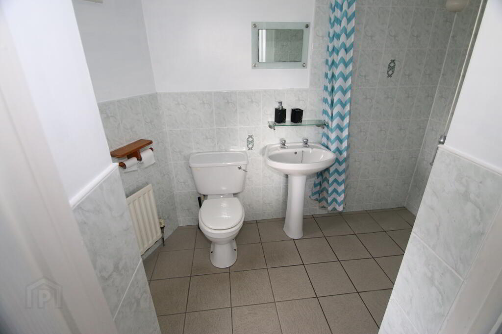 Centre light, white toilet and pedestal wash hand basin, Bristan electric shower, tiled floor, partly wall tiled, single radiator, extractor fan.