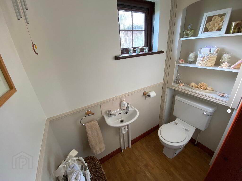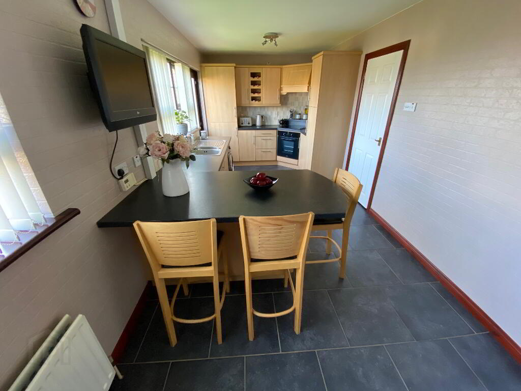 2 centre lights, tiled floor, partly wall tiled, high and low level beach style kitchen units, central heating control, double radiator, wine rack, 4 double power points, stainless steel sink, Hotpoint Creda integrated electric oven, Whirlpool integrated glass hob, Smeg integrated dishwasher, integrated extractor fan, Whirlpool integrated fridge freezer, plumbed for washing machine, emersion heater, UPVC external door with 2 glass inserts.