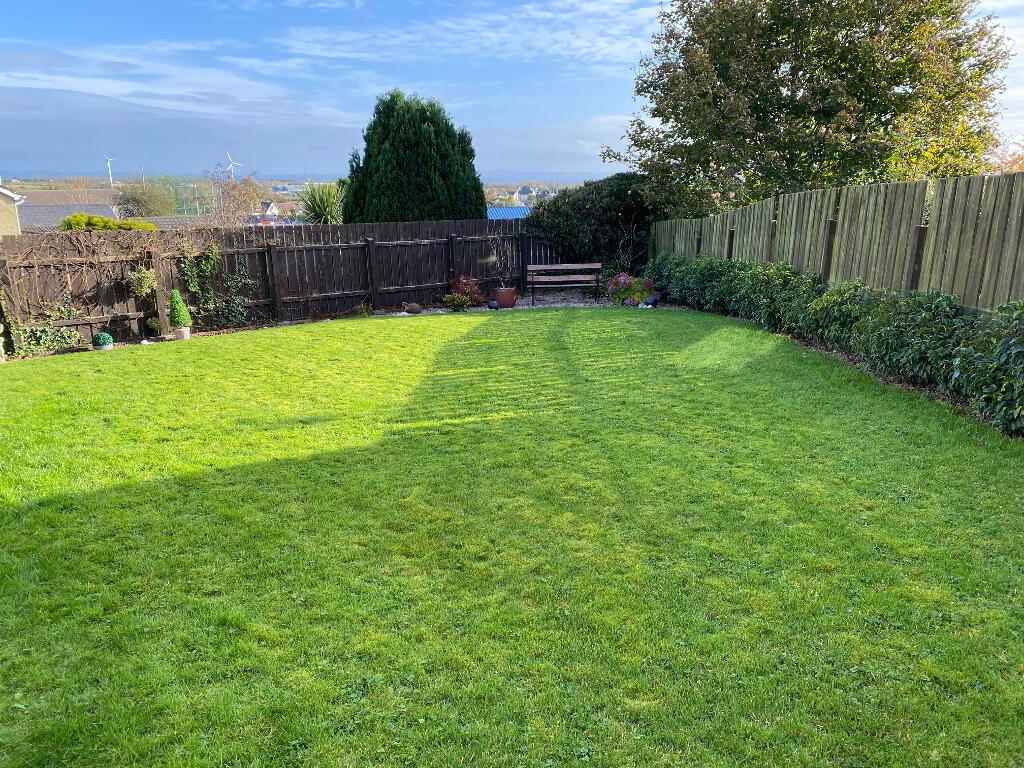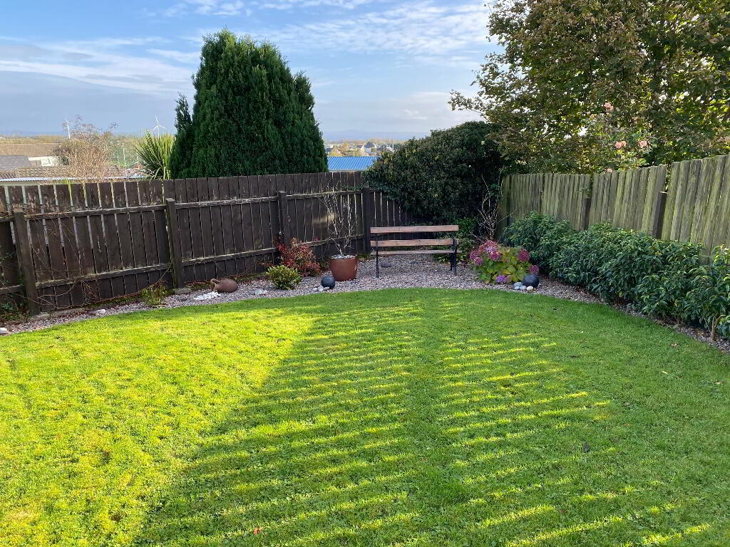 Lawn surrounded by fence, side gate, outside tap, outside lighting, oil burner, oil tank, garden shed, hedge, stone sitting area.