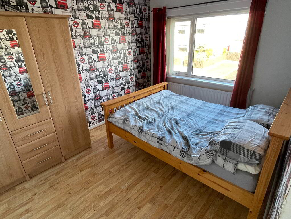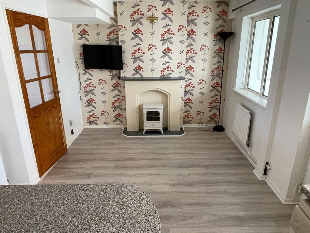 Centre light, centrepiece, laminate floor, single radiator, 1 double power point, 1 single power point, telephone point, oak style fireplace with back boiler cast iron style insert and slate hearth.