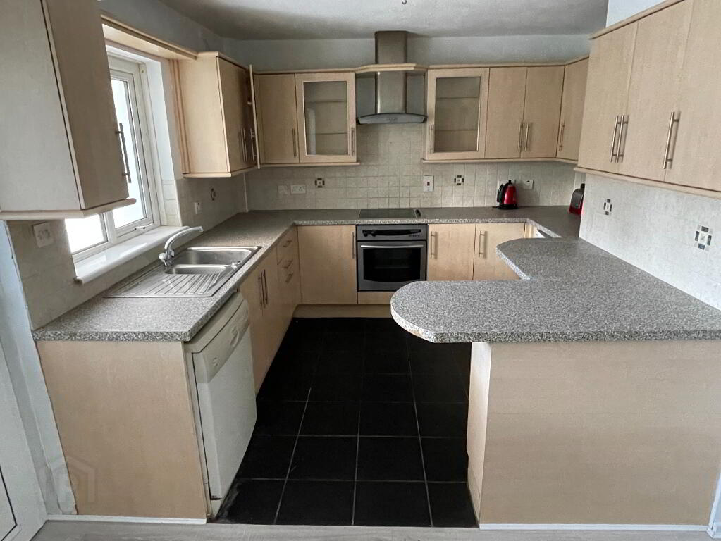 Fluorescent lighting and tiled floor kitchen area and centre light, wall light and laminate floor dining area, 2 single radiators, painted wooden fireplace with electric stove, TV point, 5 double power points, high and low level kitchen units, 2 glass display units, breakfast bar, extractor fan, Diplomat integrated electric cooker, Schott Ceran integrated glass hob, Hotpoint dishwasher, Lec fridge, partly wall tiled, unit lighting, stainless steel sink.