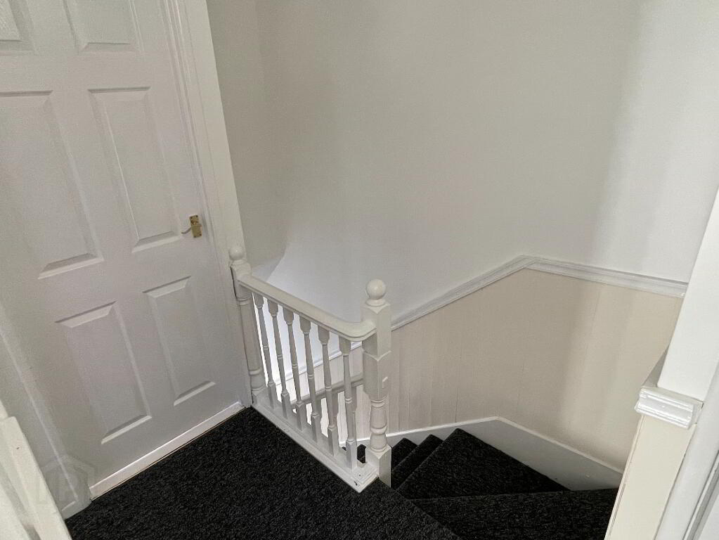 Centre light, stairs and landing carpeted, shelved airing cupboard, central heating control.