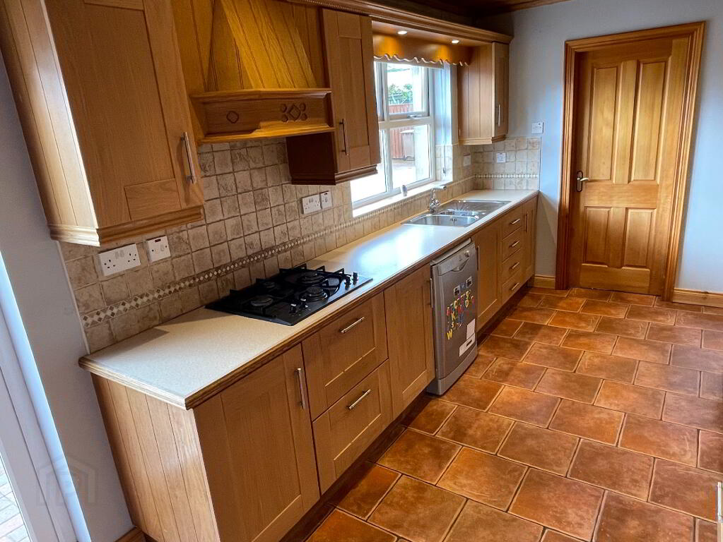 Centre light, extractor fan, single radiator, UPVC ½ glazed external door, tiled floor, partly wall tiled, central heating control, oak style storage units, stainless steel sink, 1 double power point, space for tumble dryer, plumbed for washing machine.