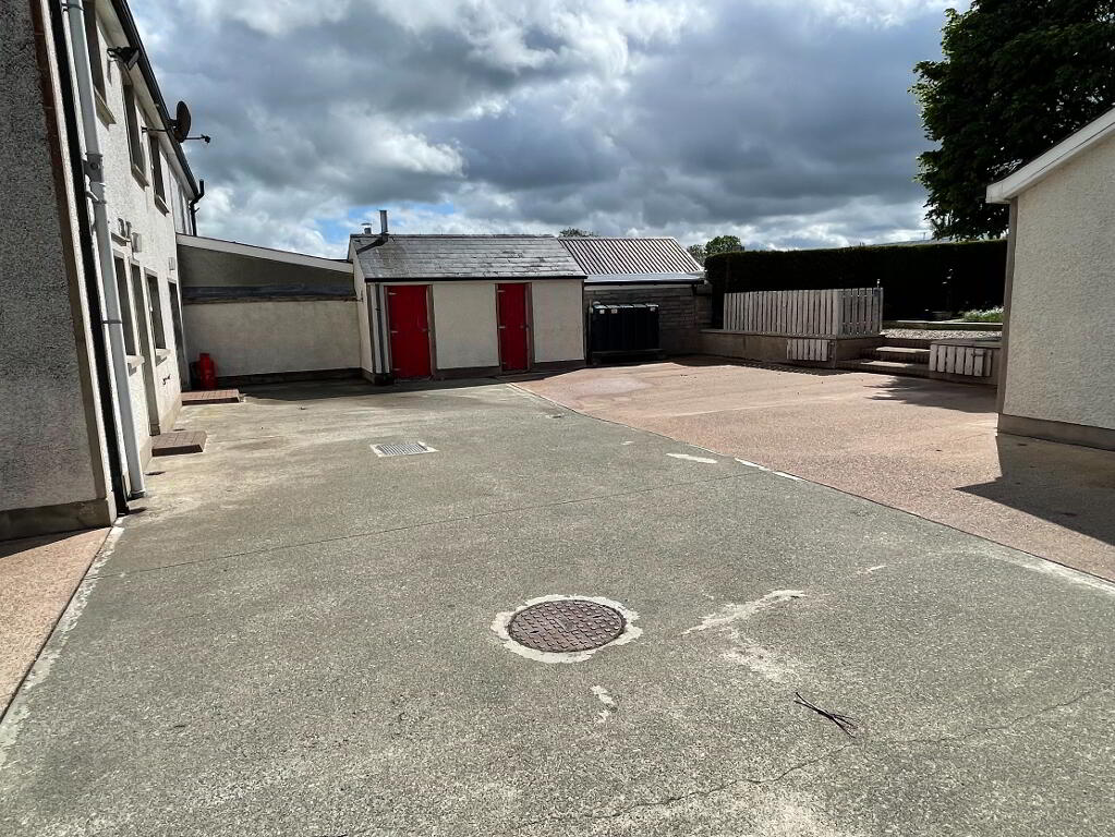 Cement parking area, side gate, fenced on one side with wall to other, outside tap, oil tank, lawn with hedge on 3 sides, outside lighting.