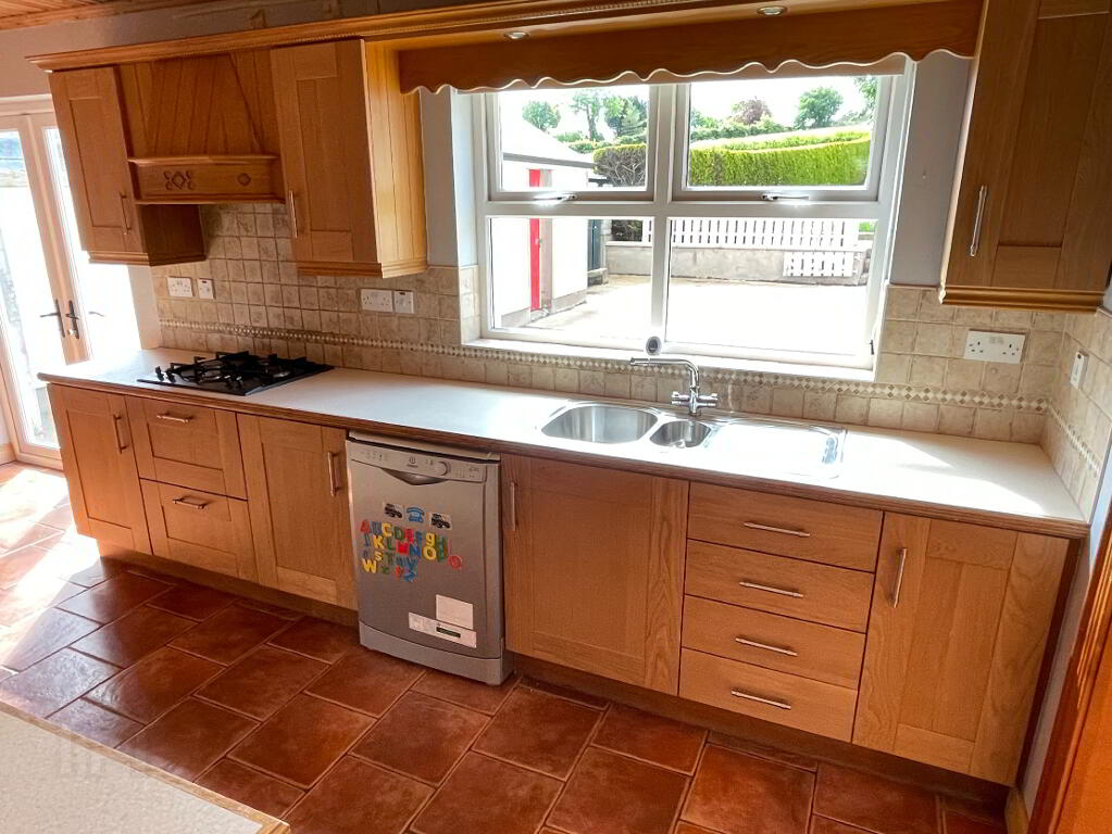 Recessed lighting kitchen area, centre light dining area, pine tongue and grove ceiling, tiled floor, double radiator, glazed double French doors to patio area, partly wall tiled, 6 double power points, unit lighting, high and low level oak style kitchen units, stainless steel sink, Hoover integrated electric cooker, Indesit integrated fridge freezer, Ariston integrated gas hob, integrated extractor fan, space for dishwasher, door with decorative glazing to hall.