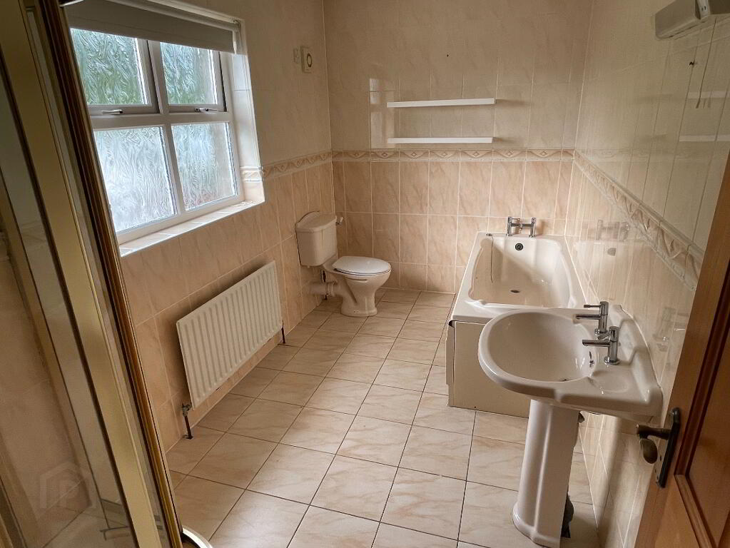 Centre light, extractor fan, tiled floor, fully wall tiled, single radiator, bathroom suite consisting of bath, toilet, pedestal wash hand basin and walk-in Redring electric shower, wall light with shaving point.