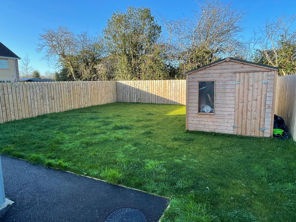 Lawn fenced on 3 sides, side entrance gate, oil burner, oil tank, garden shed, outside tap, outside lighting.
