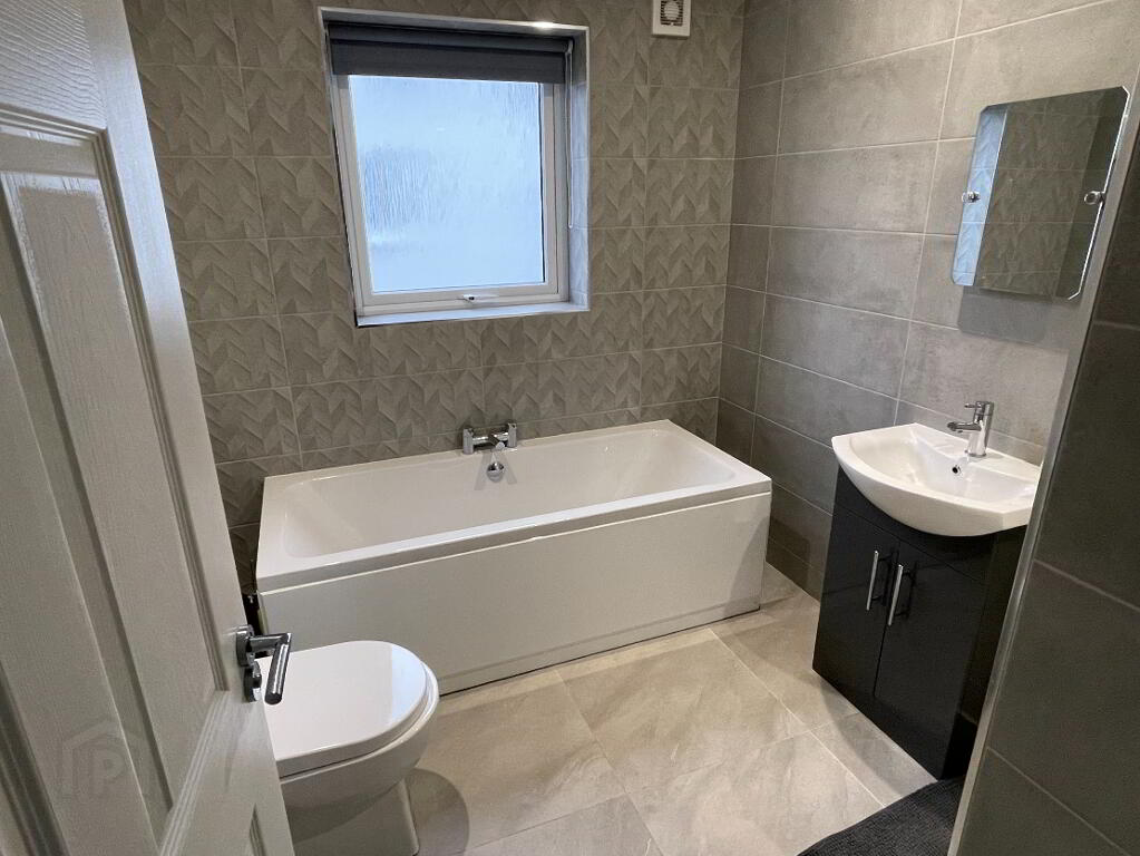 Centre light, extractor fan, tiled floor, single radiator, grey storage units, plumbed for washing machine, central heating control, UPVC half glazed door to rear.