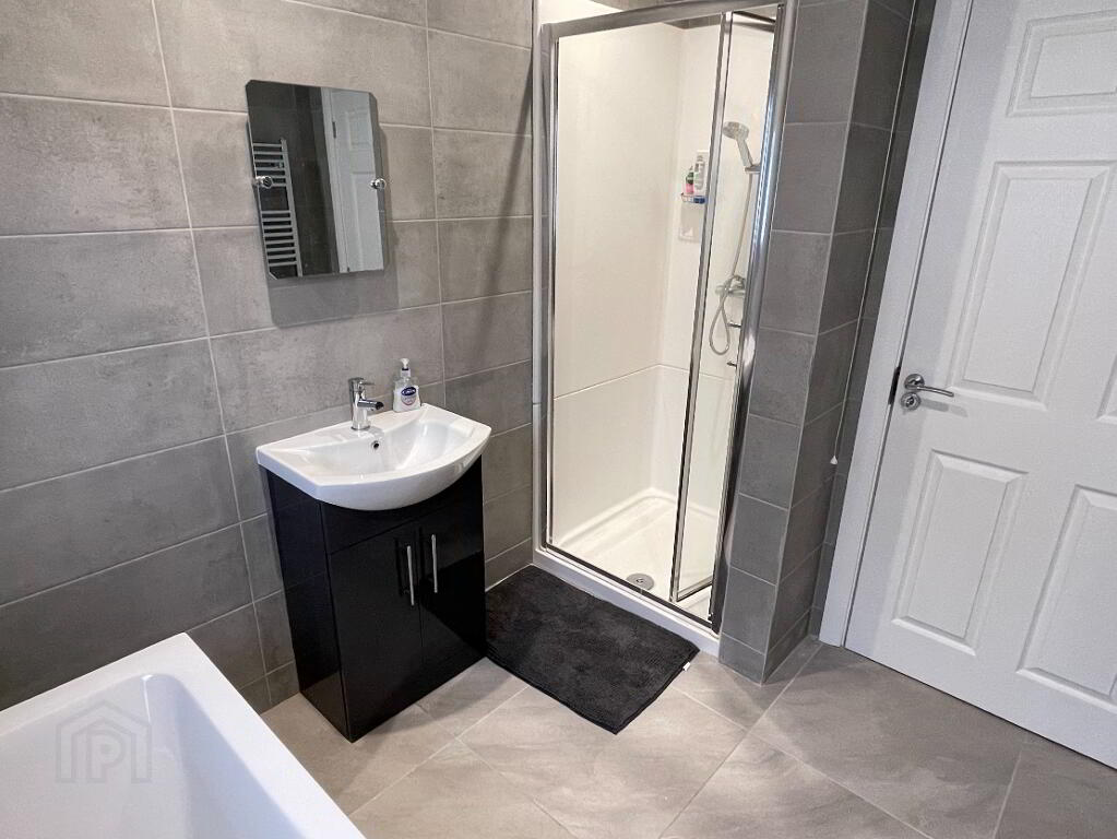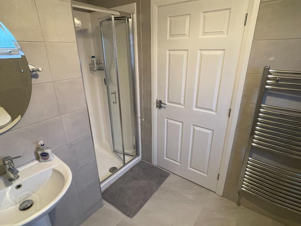 Centre light, extractor fan, tiled floor, fully wall tiled, towel radiator, white toilet and wash hand basin, walk-in Mira Sprint electric shower pod.