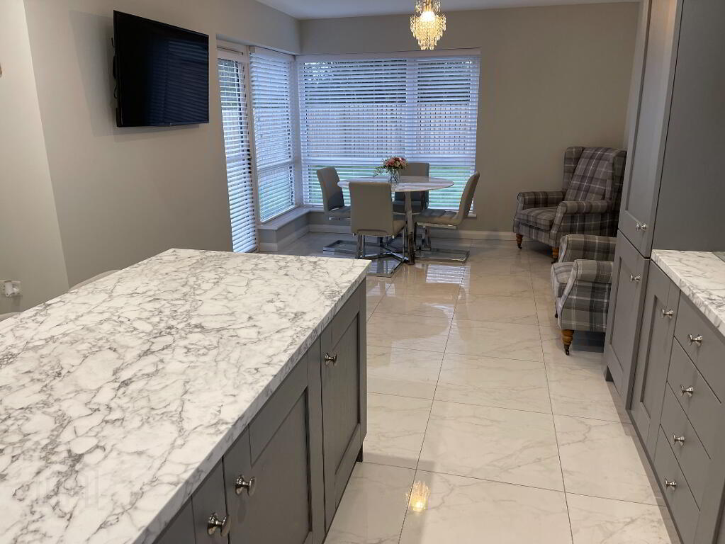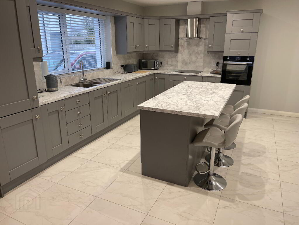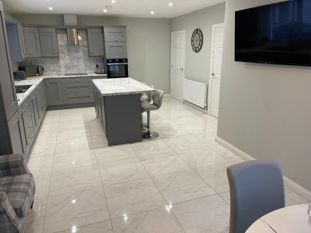 Recessed lighting kitchen area, centre light dining area, tiled floor, 1 single radiator, 1 double radiator, partly wall tiled, grey high and low level kitchen units, stainless steel extractor fan, stainless steel sink, Belling integrated glass hob, Belling integrated electric cooker, integrated dishwasher, Indesit integrated fridge freezer, TV/internet point, 7 double power points, UPVC glazed door to rear.